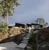 This three-bedroom holiday home on Waiheke Island by MacKay Curtis is designed to maximize sun, views, and opportunities for outdoor living. The ground-floor living area is enclosed with glass, while the bedrooms and bathrooms are housed in a timber-clad box. Sliding glass doors open the living area to the deck, which overlooks Mawhitipana Bay.