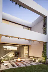 The island bar in the kitchen features white Arcilla Field tiles by Ann Sacks that match the turquoise tiles used in the guest bathroom. The lights above the bench are classic VL45 Radiohus pendants, which were originally designed in the 1940s by Danish architect Vilhelm Lauritzen for Louis Poulsen for the construction of the Radiohuset building in Copenhagen.
