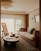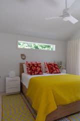 Painted white, screen removed, and decorated with just a few pieces of art, the brick fireplace looks fresh, and acts as the perfect textural foil to the glossy floors and the leafy view beyond. A photograph by Wayne Levin and a small painting by Peter Shepard Cole create a thoughtful vignette on the mantel.