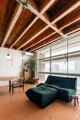 The asymmetrical vanities on opposite walls in the primary bathroom feature stone tops and backsplashes with a chiseled free edge -- a detail that came together from the collaboration between Fowlkes Studio and their clients. The free edges were designed to evoke broken stone and be different from each other, the edges reflect in the opposing mirrors.