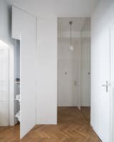 The dropped ceiling conceals mechanical systems and defines the dining room area, drawing the eye to the fabric chandelier by Pinch, and BDDW bronze trestle table with bleached maple top. The table is surrounded by Soft Edge 60 Chairs by HAY.