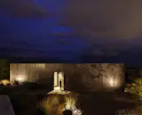 In the primary bathroom, the neutral palette and subtle tile are a play on the surrounding landscape. The clients' acreage provides them with extreme privacy, hence the views from the shower.