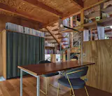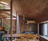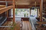 Lamps and vintage furniture that the homeowner and his partner collected on their travels adorn the home. Jun introduced an Enigma 425 pendant lamp from Louis Poulsen as a statement piece over the living space.