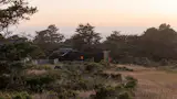Woud’s modular sofa provides a vibrant accent color used elsewhere in the house and ADU. The striped club chair is from Ferm Living; the Eames chair and ottoman were among the only things the couple brought with them from Colorado. The knot cushions are by Design House Stockholm, and the prints are by Cornelia Thomsen.