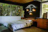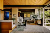 A walkway leads from a street-facing gate through a Zen garden and central courtyard to the home’s front door. To the right, a small garden shed is clad in reclaimed timbers, stacked and blackened, while the overhang is clad in naturally weathered cedar.