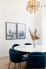 The bright living room incorporates some of their own furniture prototypes with treasured midcentury collectibles. The T-square on the wall came from the estate of Albuquerque architect George Pearl; the hanging textile opposite is by fiber artist Romeo Reyna. The Finn Juhl chair comes from another estate sale, while the lights were made from standard, off-the-shelf parts. Darci and Dale also built the console and coffee table.