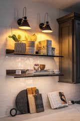 Now, the kitchen's workspace has been considerably expanded, which makes it multi-functional. During the day, it's Kevin's design studio; at night, it's ready for relaxing. Black IKEA cabinetry is a streamlined backdrop for the warm wood accents and geometric wall tile, the latter from Wayfair. The stools are from Blu Dot.