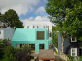 “I wanted you to come into a place that was inviting, but with a muted warmth,” says Kara of the decision to immerse the dining room in Farrow & Ball’s Green Smoke, including walls, ceiling, cabinetry, and fireplace, the latter with a relocated mantel. The table is a 17th C. Spanish Walnut Trestle Rectangular Dining Table via Restoration Hardware, surrounded by Ceremonie Green Mohair dining chairs by Athena Calderone, from Crate&Barrel. The Tambor Buffet, beneath windows that Seamus relocated from elsewhere in the house, is from Anthropologie.