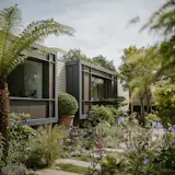 Mirrioring the home's ceilings, the pergola is also constructed from redwood.