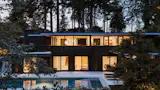 Barry Downs and Fred Hollingsworth designed this 1967 home with long banks of windows, extensive wood paneling, and a pool at the forest’s edge.