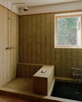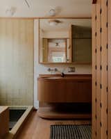 This added bathroom, just off the pool deck, was designed to be resilient to water, with Heath Ceramic tiles cladding both the walls and floors. The California Faucet fixtures come directly out of the wall, above a Duravit sink, next to a Pottery Barn Windsor mirror and Quiet Town curtains.