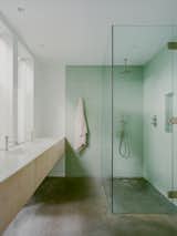 Light pours through clerestory windows in the master bathroom. Staying true to the home’s overall aesthetic, Sweet used simple, contrasting materials—white oak for the cabinets and Ann Sacks white tiles for the walls.