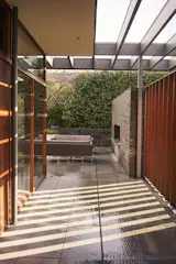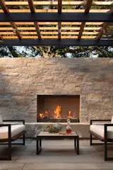 The Irwin pool house designed by Landis Gores in 1957 boasts a central room with high ceilings and an unobstructed view of the landscape. In 2005, the Town of New Canaan purchased the property and added exhibition spaces, as well as rooms for lectures and events. The small pavilion also houses an oversized, monumental brick fireplace design that divides the main space from the kitchen area.