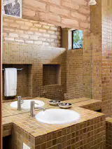 Much of the original furniture remains in the home, including wooden bookshelves set into concrete room dividers. “I find the way he resolved the corners with obtuse angles quite beautiful,” writes Maria. “He used the same detail for both the table and the bookcase. The photographers were drawn to the materials in addition to the form of the furnishings. “I love all the materials inside the house, especially those that were used by Riva to create the furniture,” says Francesco Paleari, who with Allegra Martin shot the apartment for the first time in decades for the book.