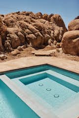 Mexican encaustic tiles with a geometric floral pattern from Mosaicos Terra line the bathroom in Austin’s studio, where a full-height window near the wall-mounted shower provides a view to the expansive outdoor scenery. A vintage kewpie doll sculpture sits atop the custom terrazzo-and-granite counter; the steel mirror is from Artes de México.