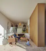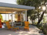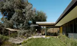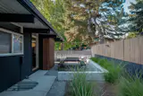The yard feels secluded thanks to solid fencing and a buffer of dense greenery. Benches by Angel City Lumber, stacked on stones and all from Molly’s home state of Oregon, create a seating moment to look back at a towering cork oak tree. The pavers and Adirondack chairs are all from OR.CA