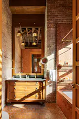 What was once the bunkroom is now the primary bedroom. A midcentury dresser from Facebook Marketplace joins a bed designed and built by Bottenfield.