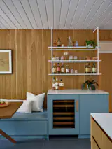 The wall between the dining room and kitchen was opened up to increase the flow and make room for an extra-long island that totals fifty linear feet of counterspace. At the center of the plan is the slatted woodwork that covers a core for the kitchen storage, a bathroom, and a laundry room. “That became a wonderful opportunity for a beautiful wood feature,” says Maziarski.