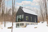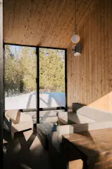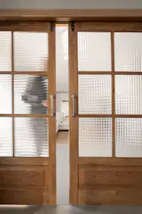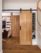 To the right of the entrance, sliding tongue-and-groove laurel plywood doors open up to reveal the bathroom.