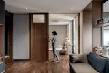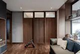 Likewise, a sliding door at the entrance to the bedroom saves space.