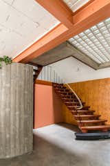 The red Up chair is a classic Italian design... and a piece Patnaik bought before they'd even broken ground on this project. The pine ceiling adds some visual warmth to balance out the cool metal and tiles. (Patnaik originally had visions of doing the whole home in pine, but the damp climate would've made maintenance too challenging.)