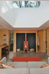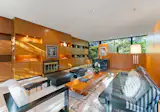 Jewel tones and floral prints define the drawing room’s furnishings, which were sourced from around the world. The room’s centerpiece is a large double-face fireplace finished in handmade olive-green ceramic tiles. In the evenings, a champagne cart rolls through the room and a pianist plays in the background.