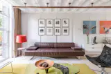 Located in a pre-war building, the floor-through unit had a fairly generic layout: two bedrooms on either end and a cloistered kitchen and living area in the center. “Everyone just wants to hang out by the windows,” Graci says of these fairly common floor plans, noting that the center becomes dead space. She turned one of the bedrooms into this living room and office, removing a wall between it and the kitchen to create a free-flowing public area of the apartment.