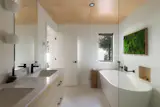 “Where we let loose was on the window,” Matt says. “It’s an aluminium window frame, which is bushfire compliant and easy to install, but the way that we detailed it was about hiding the frame so that the eye is drawn into the space.”