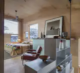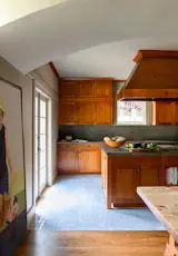 Both the walls and the maple cabinet facings in the kitchen are covered in a toxin-free whey-based finish. Clove-colored 2-by-10-inch backsplash tiles mimic the alley’s brick street, and the wall is covered in spray cork, a paint substitute made primarily of cork granules. The door pulls are closet knobs that Jack retrieved from his grandfather’s house in D.C. before it was torn down.