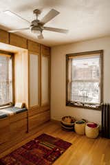 In the dining room, Tang installed a built-in reading bench under the windows. It’s upholstered in ikat fabric and anchored by bookshelves at one end. The vintage Danish cabinet belongs to the owners, while the brilliant, deep orange pendant was sourced by Tang’s team. It’s a 1960s Equator pendant by Jo Hammerborg for Fog and Morup.