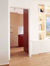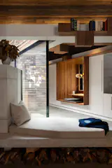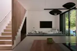 On the east side of the home, two large bay windows, their wood frames sandwiched between concrete, have hinged side panels that open to let in breezes. “The bay windows are like two eyes,” says Derek. “My favorite aspect of the house is at night when the lights are on, and they act like weird two-way mirrors. You can see it’s night outside, but they reflect the interior in a way that gives it a sense of being a completely different space.”