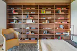The living room is highlighted by a classic floor-to-ceiling fireplace, built-in sofa and custom cabinetry.