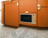 Two pull-down compartments in the kitchen hide an electric cooktop and chopping block, while paper towels are tucked away in a curved yellow container. “I didn’t want anything out in the open,” Ash says.