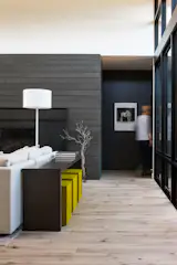 The floor and the wall merge into one as concrete, wood, and subtle, warm tones create an integrated look. Customized furniture and built-in pieces throughout add to the minimalist vibe.
