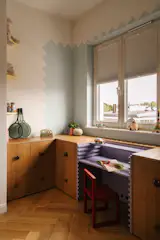 Sugarhouse reworked the living room storage and reoriented the room to better occupy the available space. An Ellison Studio sofa, recovered in Dedar Patchwork Fabric, fits the whole family for movie nights. The coffee table is from Etsy and the rug is Nordic Knots. The overhead light is a vintage Poul Henningsen via 1st Dibs.