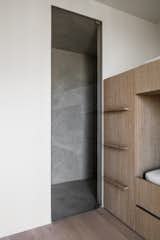 The home’s front façade features an anodized aluminum and glass curtain wall by Kawneer that's framed by Vic West black corrugated metal panels. The board-formed concrete on the exterior enables passive solar absorption, allowing optimal heat retention on cold winter days. The metal and concrete exterior cladding offers cohesive dialogue with the neighboring industrial sheds and commercial buildings.