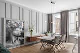 In the kitchen, White Oak floors, inset walnut cabinets, Fireclay subway tile, and Caesartone countertops read more classic vibes, while the furnishings—such as the Reno Table from Structube, Channel Chairs by Industry West, and ADAM Stools by Frama Denmark—are modern counterpoints. Appliances include a Thermador 36" Freedom Induction Cooktop and an inconspicuous Thermador 36" Downdraft Ventilation, as well as a Miele Dishwasher, convection oven, and speed oven.