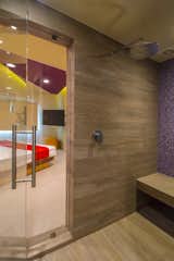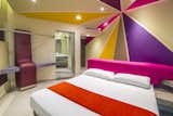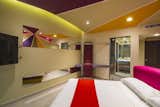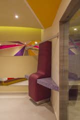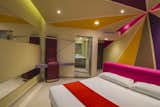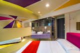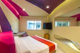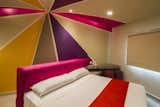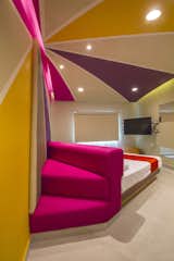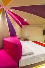 The common thread is the uninterrupted exchange of strokes, shapes and colors imprinting dynamism to the walk between the rooms filled with purple, pink and sand tones. In the interior of each room the colors trajectory continues through the concave plafond transmitting a funny and psychedelic felling that is emphasized in the beds angles.