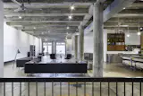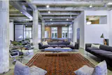 Casale and Crofton’s bedroom is configured as a casual open suite, with a sliding aluminum screen as the only barrier separating an adjacent bathroom and walk-in closet. The screen’s dappled, lacelike pattern was designed by Fiyel Levent, a local artist and architect. Bischoff handed her design to a metalworker, who then carved it into aluminum with a digital laser cutter. It runs on a track in front of a partial wall covered in wallpaper by Neisha Crosland.