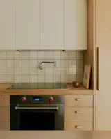 Oak walls with integrated storage and clerestories supply sleekness for the hallway.