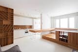 “Perhaps the most recurrent request from the client was to create as much storage space as possible, which they desperately lacked in the original apartment,” Hammer says. The kitchen’s medium-density fibreboard cabinets provide plenty of room to keep things tidy. Tom Dixon bar lamps hang over the island.