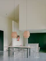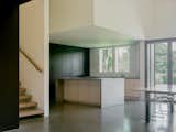 New custom walnut cabinetry syncs with the rest of the built-ins throughout the home, to create a pleasing rhythm in the open plan. The backsplash is Heath Ceramics tile, and the counter is Pental Quartz. Open shelves at the rear overlook a cozy den, and allow sightlines out the new windows at the front of the home.