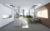 This spacious kitchen was designed for simplicity and functionality. Black and white kitchens that incorporate elements of gray tend to have a softer look. Seen here, gray accents, like the pendant lights and backsplash color, abound. Says the architect, "The design of the interior achieves a softer touch by using bespoke detailing and a rich palette of materials such as stone and timber."