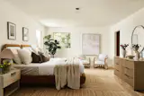 The kitchen contains an oversized island with casual dining on two sides. The island is directly below heavy timber beams that span from interior to exterior and are a focal feature of this home. Full height wood cabinetry is built into the thick walls to help the space feel more open. Terrazzo countertops and yellow pendant lights add splashes of personality to the space.