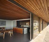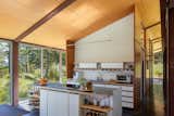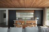In the kitchen, White Oak floors, inset walnut cabinets, Fireclay subway tile, and Caesartone countertops read more classic vibes, while the furnishings—such as the Reno Table from Structube, Channel Chairs by Industry West, and ADAM Stools by Frama Denmark—are modern counterpoints. Appliances include a Thermador 36" Freedom Induction Cooktop and an inconspicuous Thermador 36" Downdraft Ventilation, as well as a Miele Dishwasher, convection oven, and speed oven.