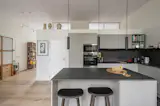 The kitchen now features a seating area featuring a Moooi Container table, Hay chairs and a banquette upholstered in a crimson fabric by Kvadrat. The pendant is by &Tradition.