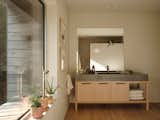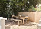 The expansive kitchen now blurs into the living room. Vintage stackable chairs from Rotor Deconstruction in Brussels, where Sarolta used to work, surround &Tradition’s In Between table. Behind it, Valchromat cabinetry is juxtaposed with tiles and Nemo Lighting’s Applique Cylindrique Petite wall lamps designed by Charlotte Perriand. Shelves of tableware, like the vintage Karcagi glasses made by the porcelain factory her family once owned, add character.