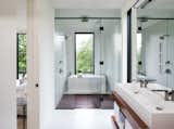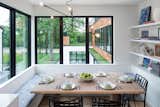 The staircase works as a visual transition from the cozy first level to the more modern second floor. When standing downstairs, the staircase pulls away from the dark anchoring floorboards with angled steel beams, stainless steel cables, and wood caps. “It’s thin and light so that it wouldn’t impede connection to the first floor,” says Michael. “It’s meant to be pretty modern, but the wood cap softens the look a little, and makes the experience of touching the railing softer.”