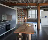 Inside the unit, Robb (Robb Studio) and Bishop (Studio Gild) inherited several attractive features: 14-foot ceilings, exposed concrete, and a fireplace set within the original chimney stack of the building. The primary goals included making the kitchen more prominent within the home— it was moved forward to engage more acutely with the dining and living room spaces—and to properly showcase the client’s art collection (much of which, including an eight-panel painting by Matt Mullican that stretches across nearly an entire wall).Add a caption