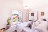 Many of the home’s original finishes could not be salvaged, including the walnut plywood in the dining area and kitchen. The siding was replaced with a fresh veneer of the same wood. Recessed baseboards give the kitchen island, topped with a Whitehall Cambria countertop, the appearance that it is levitating. The gilded hanging lamp by Peill & Putlzer was purchased secondhand in France.